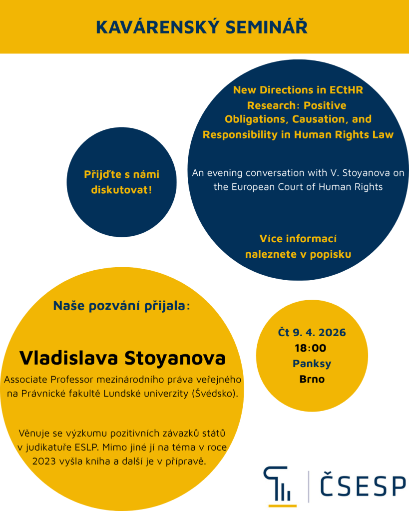 This time, Vladislava Stoyanova has accepted our invitation and will join us in Brno from Lund University, Sweden. The seminar will take place at the Panksy coffeehouse in Brno at 18:00 on Thursday, April 9th. It will center around New Directions in ECtHR Research: Positive Obligations, Causation, and Responsibility in Human Rights Law.